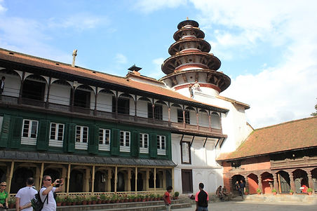 之後進去了一旁的皇宮博物館Royal Mahendra Muerum,這邊原本是連Kishor都得買票才能進來的,但警衛看他是帶著我的當地人,把他充當成了我的導遊,放行了他跟著我一起進來。一旁的建築牆上掛著歷代君主的畫像,穿過走廊進去到底有個四周都是建築的內庭裡有個小小的類似祭祀的地方。往另外一邊走,可以爬上一個塔樓,一路爬上老舊狹窄的木造階梯,有種無止盡的感覺,每上到一層以為是頂端了時,卻發現一旁還有更窄的梯子可以上去。上到頂端可以俯瞰皇宮建築群和廣場。