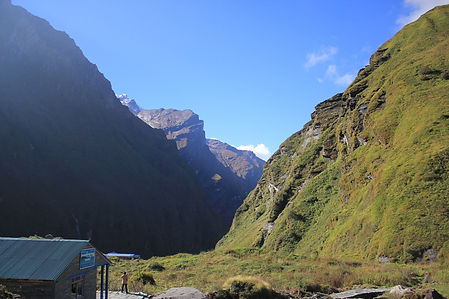由於角度的關係,早晨的谷地無法接受到陽光的洗禮,顯得有點陰溼,看著遠方白色山峰被陽光照射地閃閃發光,這段往魚尾峰基地營MBC(Machhapuchhare Base Camp)的路並不難,只是一直走在不平不穩的石頭路上不得將注意力專心在腳上,偶爾停下來休息時,才好好感受一下被群山高峰環繞著的感覺。以為自己已經身在高處,連玉山的高度都已經在自己腳下,但看向兩旁的山峰,自己所在的位置可能還不及它們的一半,人生何嘗不也是如此的,一山總是還有一山高啊。