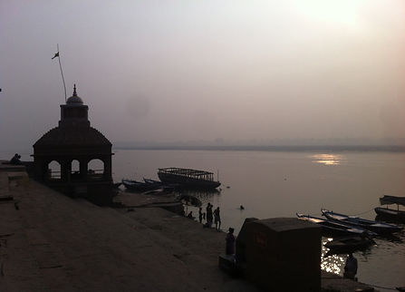 今天早上和昨天一樣,霧氣瀰漫,等到發現的時候太陽早已脫離的地平線有一段距離,朦朦朧朧的藏身在霧氣裡頭,更增添了此刻的寧靜。雖然談價過程不算愉快,但畢竟是久賴以維生的職業,大叔還是邊費力划著船邊向我介紹岸邊的河壇,經過火葬祭壇Manikarnika Ghat時還向我示意可以從船上偷偷拍照不會被抓。打從一開始我就對於拍火葬沒有興趣,經過昨天的事件之後讓我更加不打算這麼做。