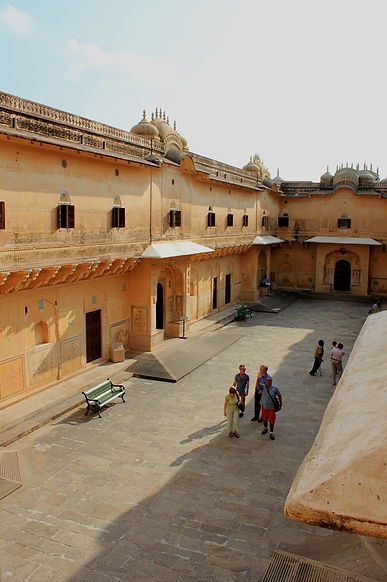 過了第一道城門之後,是一個大型的廣場,大象們在這裡卸下乘客準備掉頭下山,一旁的建築物裡有店家和售票處。在這裡我功課沒做足,只買了琥珀堡的票,沒注意到可以買聯票,聯票包含了齋浦爾市內其他幾個景點的門票,像是 風之宮、市中心博物館之類的。